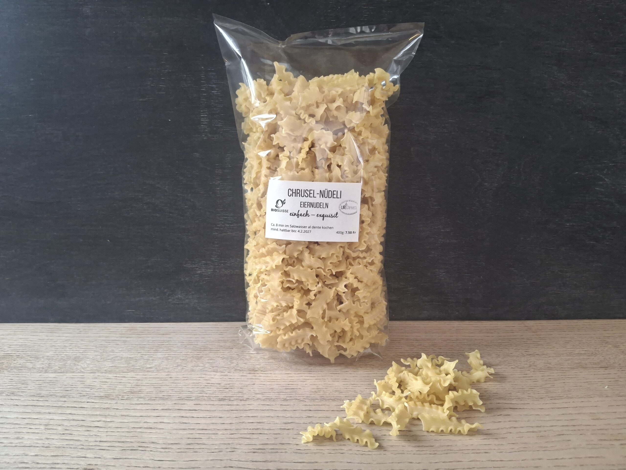 Hergestellt in Saland von Marina Fuhrer auf dem Hof Girentobel (https://hofprodukte-saland.com/) aus hofeigenen Eiern vom Hof Hegisau und Schweizer Urdinkel-Mehl.