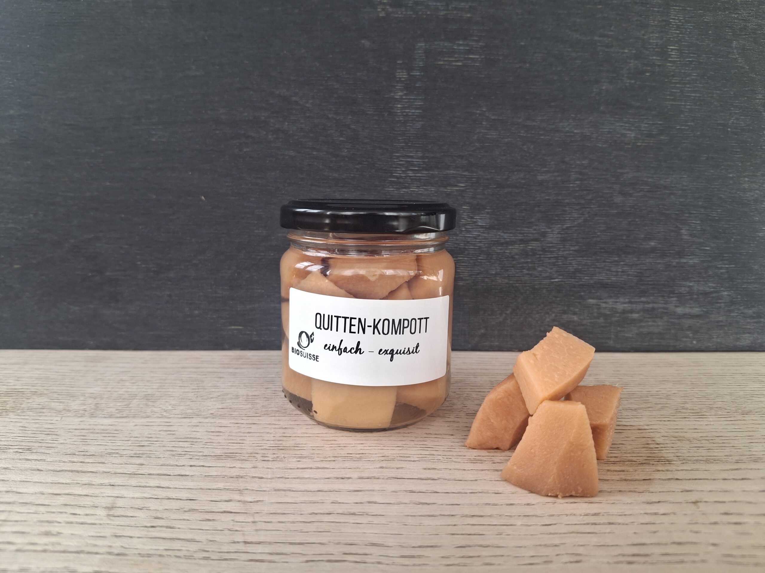 Im Zuckersirup sterilisierte Quitten aus hofeigenen, sonnengereiften Quitten-Äpfeln. Passt gut zu Gschwellti oder Raclette, im Müesli oder als Dessert mit Zucker und Rahm.